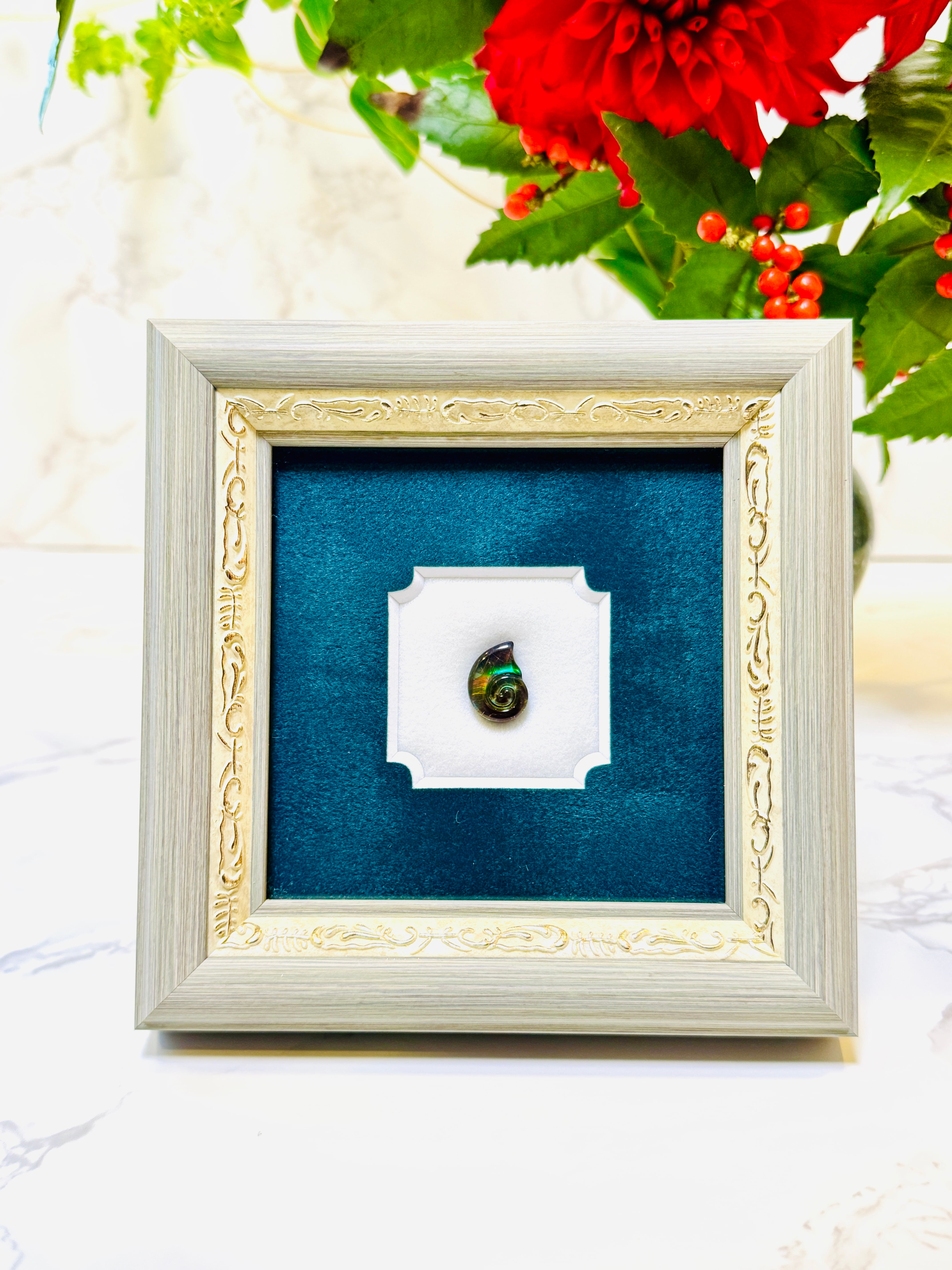 【アンモナイトの形をした貴重な宝石「アンモライト」の一粒を大切に飾ったジェムフレームです。