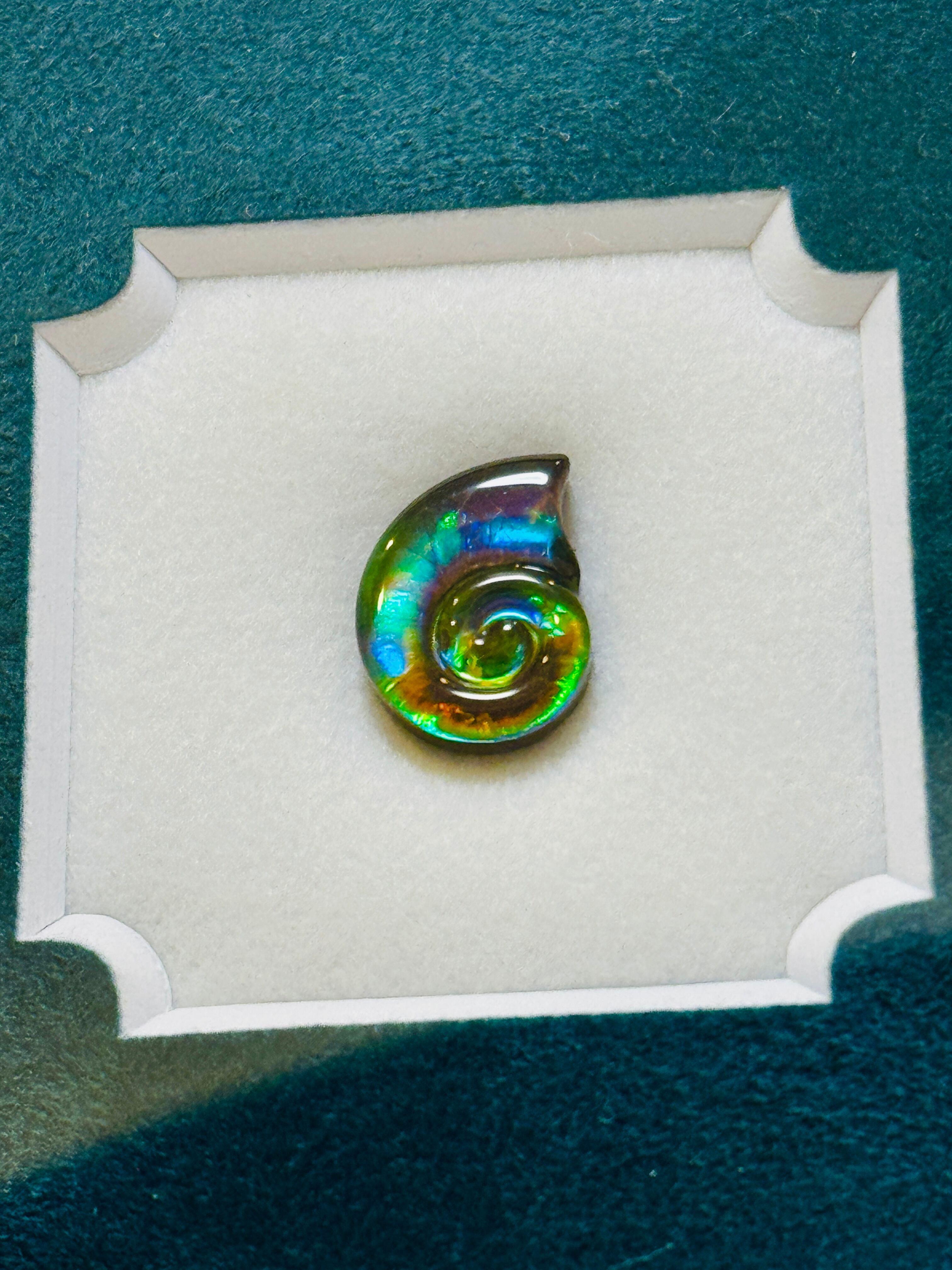 アンモライトとは、アンモナイトが化石となる過程で、ある一定の条件により奇跡的に殻の表面に宝石のような虹色の輝きを持って化石化した、化石宝石です。その殻の薄い表面を宝石として加工したものがアンモライトの宝石ルースです。こちらのルースは、可愛らしいアンモナイトの形に研磨したアンモライトの表面に、人工スピネルを貼り付け保護加工をした宝石です。(通常アンモライトを宝石として扱う場合は、とても薄い層で脆いためこのような保護加工をするそうです。)
