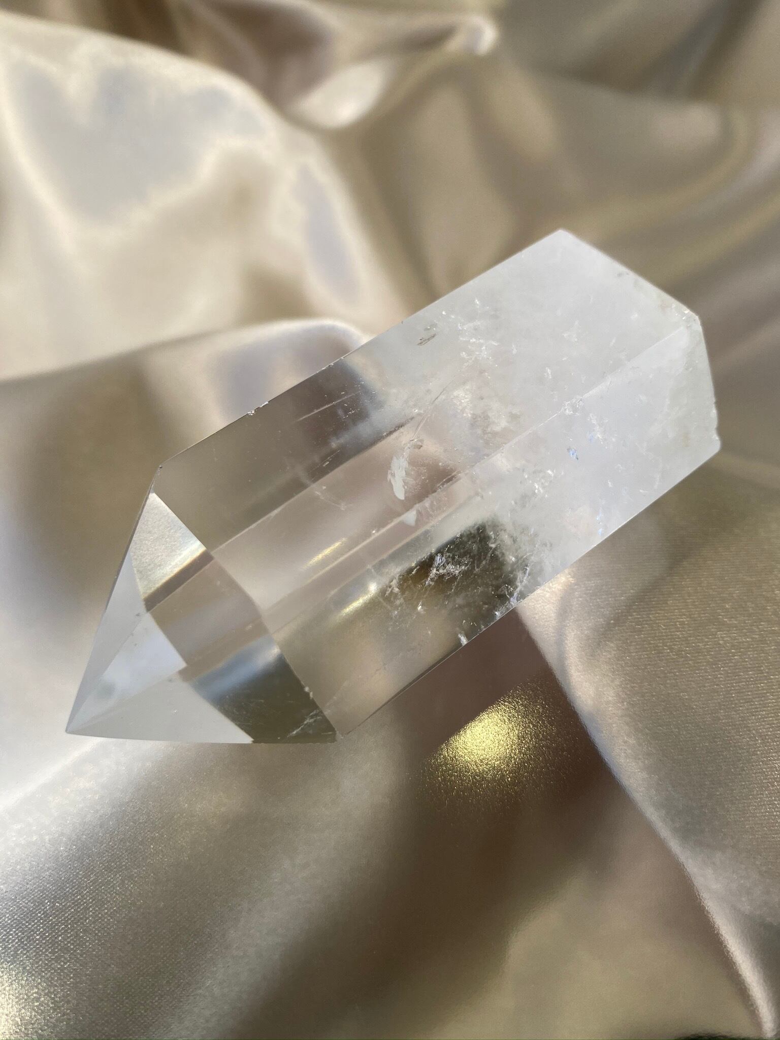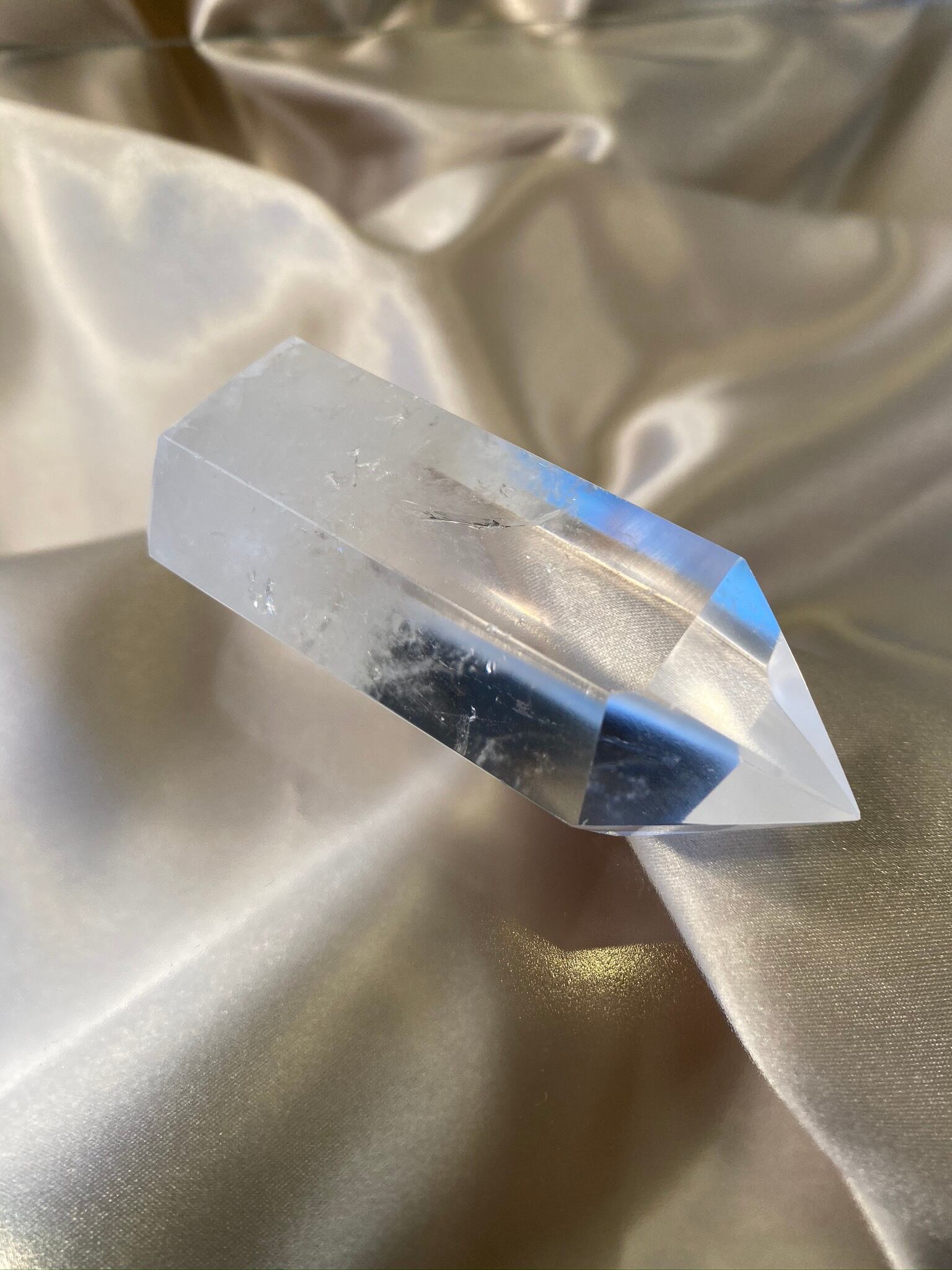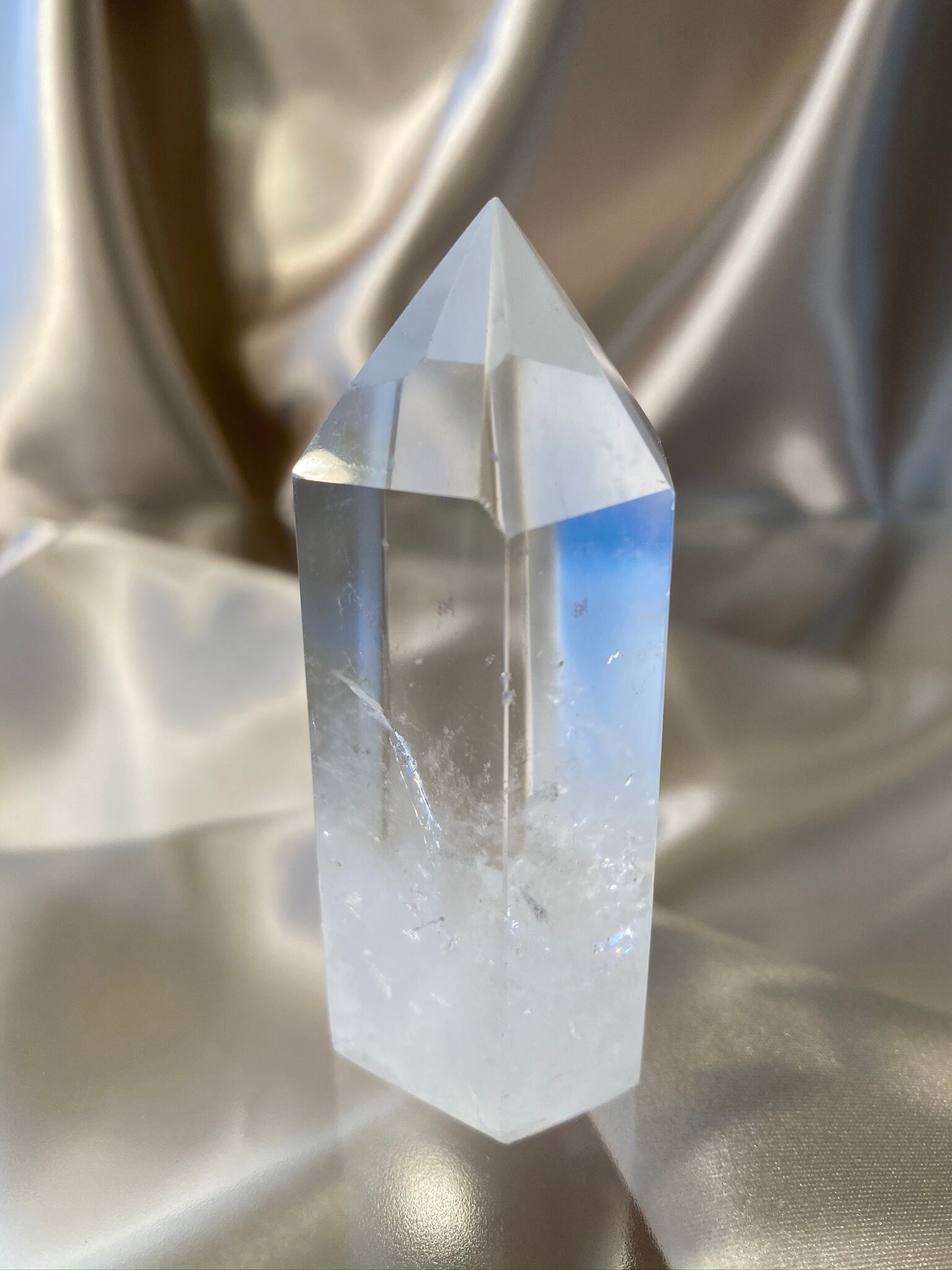 上部の透明度が高い水晶のポイント型です。下部の白い内包物も雪が積もった様で幻想的です。中央のクラックに光が当たると見える虹のラインが上に向かって伸びる様に見えます。