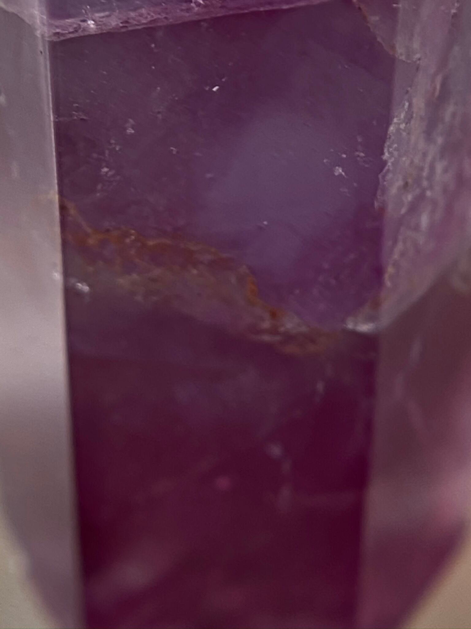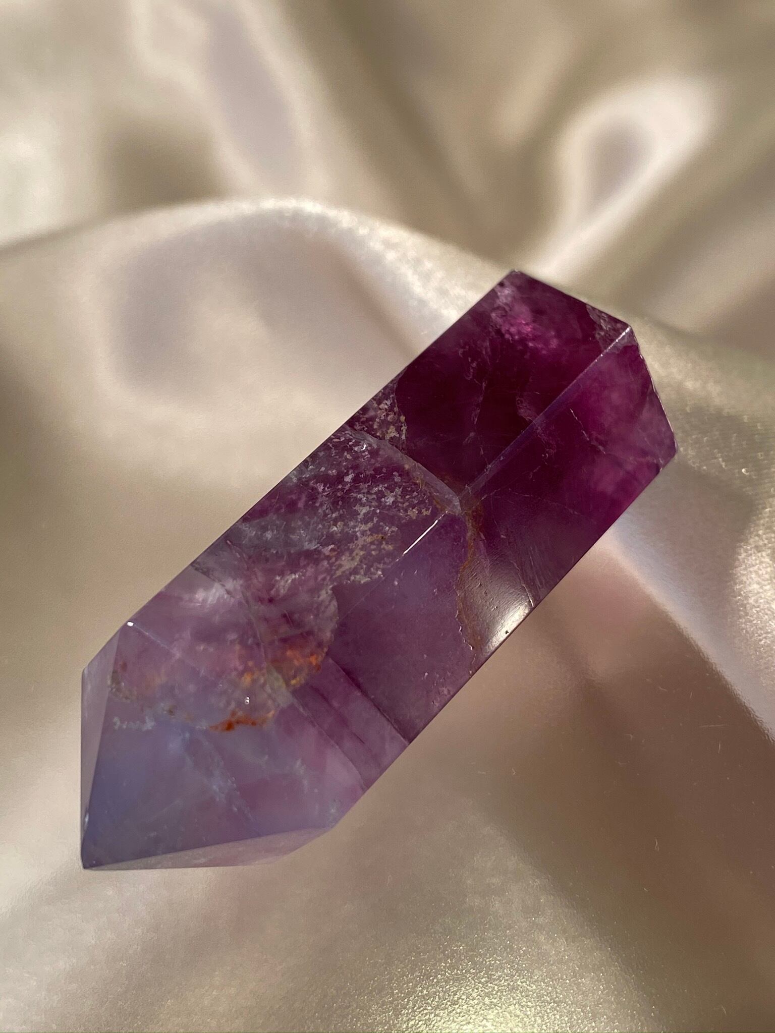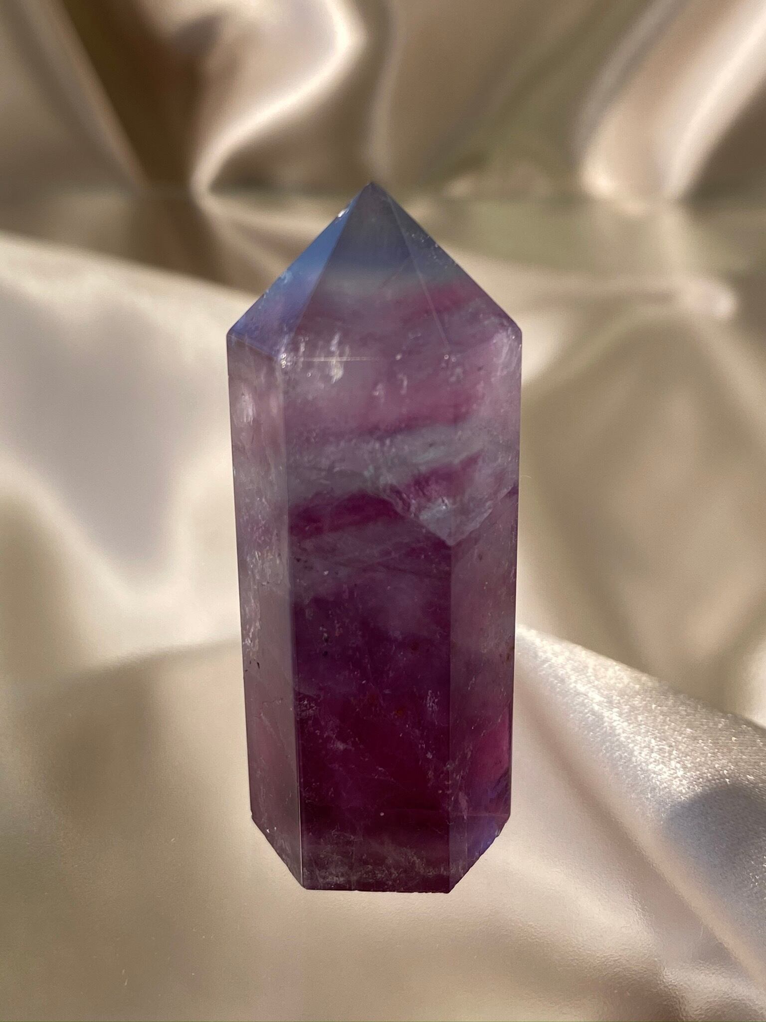 フローライトポイント型、小さいサイズです。下部が上品な紫、上部に淡いグリーンのグラデーション。クラックがとても綺麗な表情を出しています。小さいサイズですので大事な試験や会議、プレゼンのお供の持ち歩き用にも。
