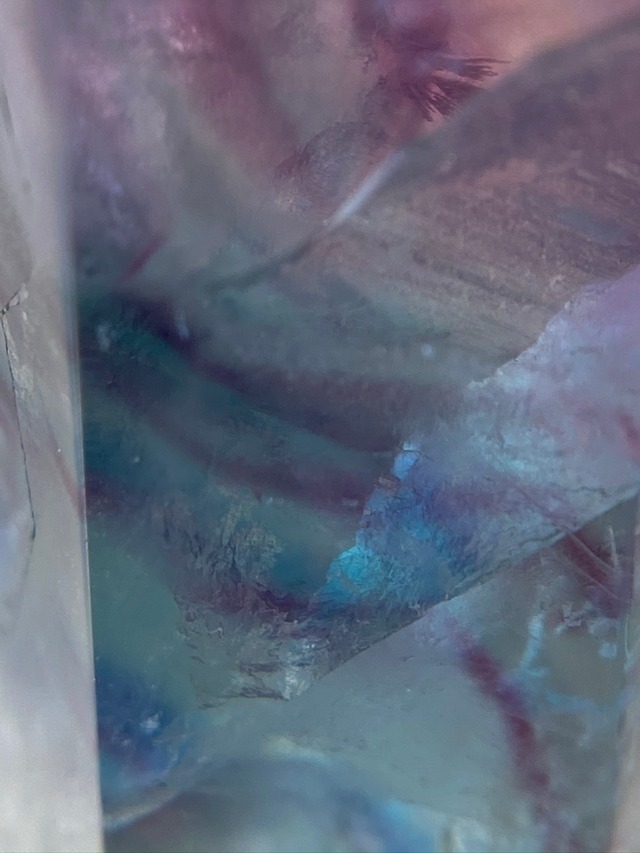 フローライトのポイント型です。透明感のある淡いグリーンやピンク、紫のグラデーションにクラックが多く入り多様な表情があります。小さいサイズですので大事な試験や会議、プレゼンのお供の持ち歩き用にも。