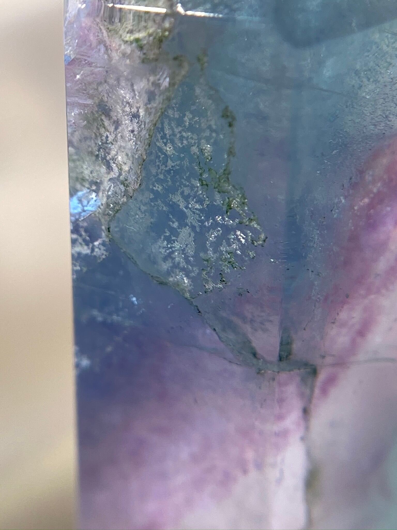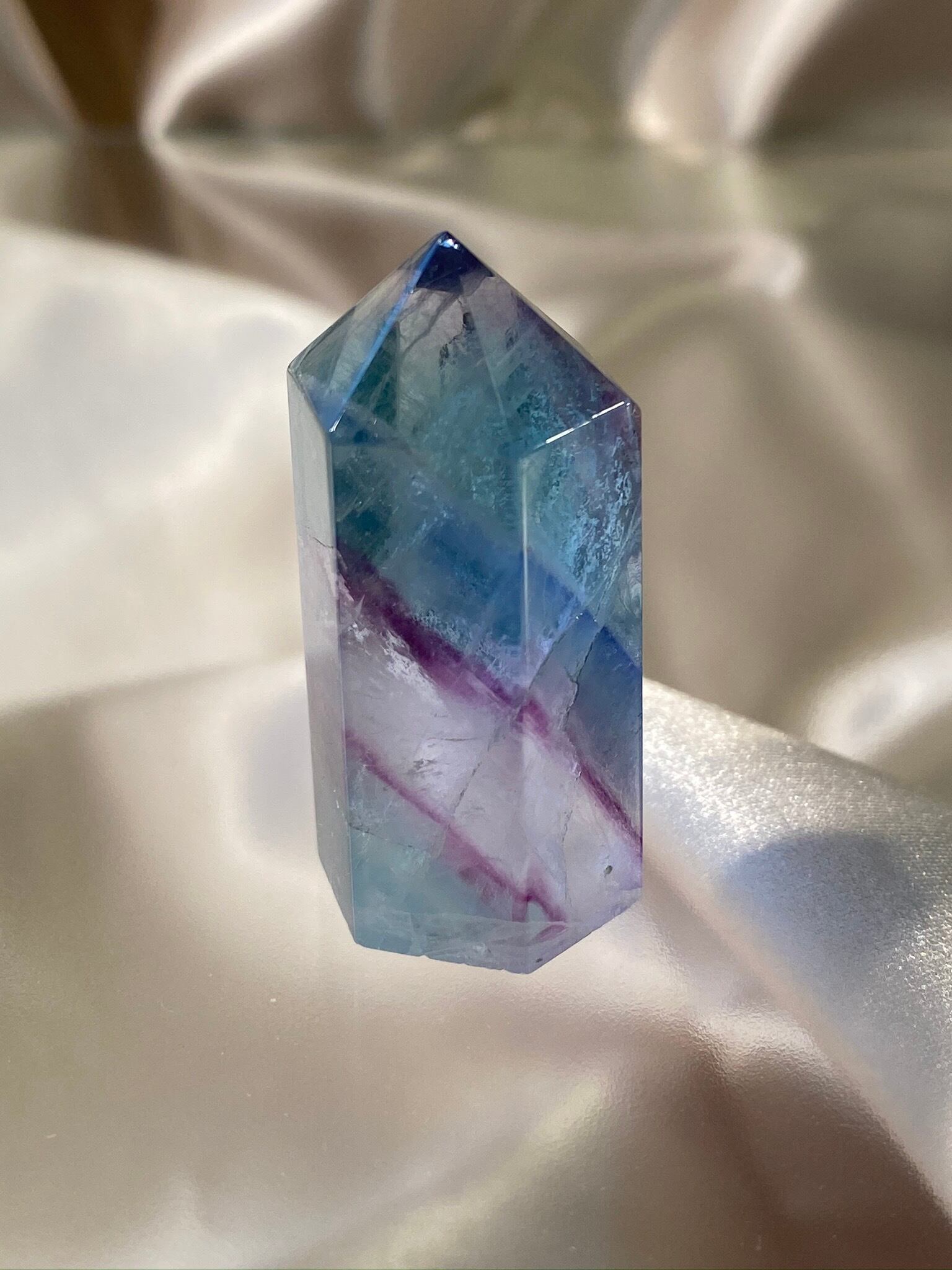 フローライトのポイント型です。透明感があり、淡いグリーンと白の間に紫のラインが入るグラデーションです。小さいサイズですがクラックや内包物で見る角度による違いを楽しめます。