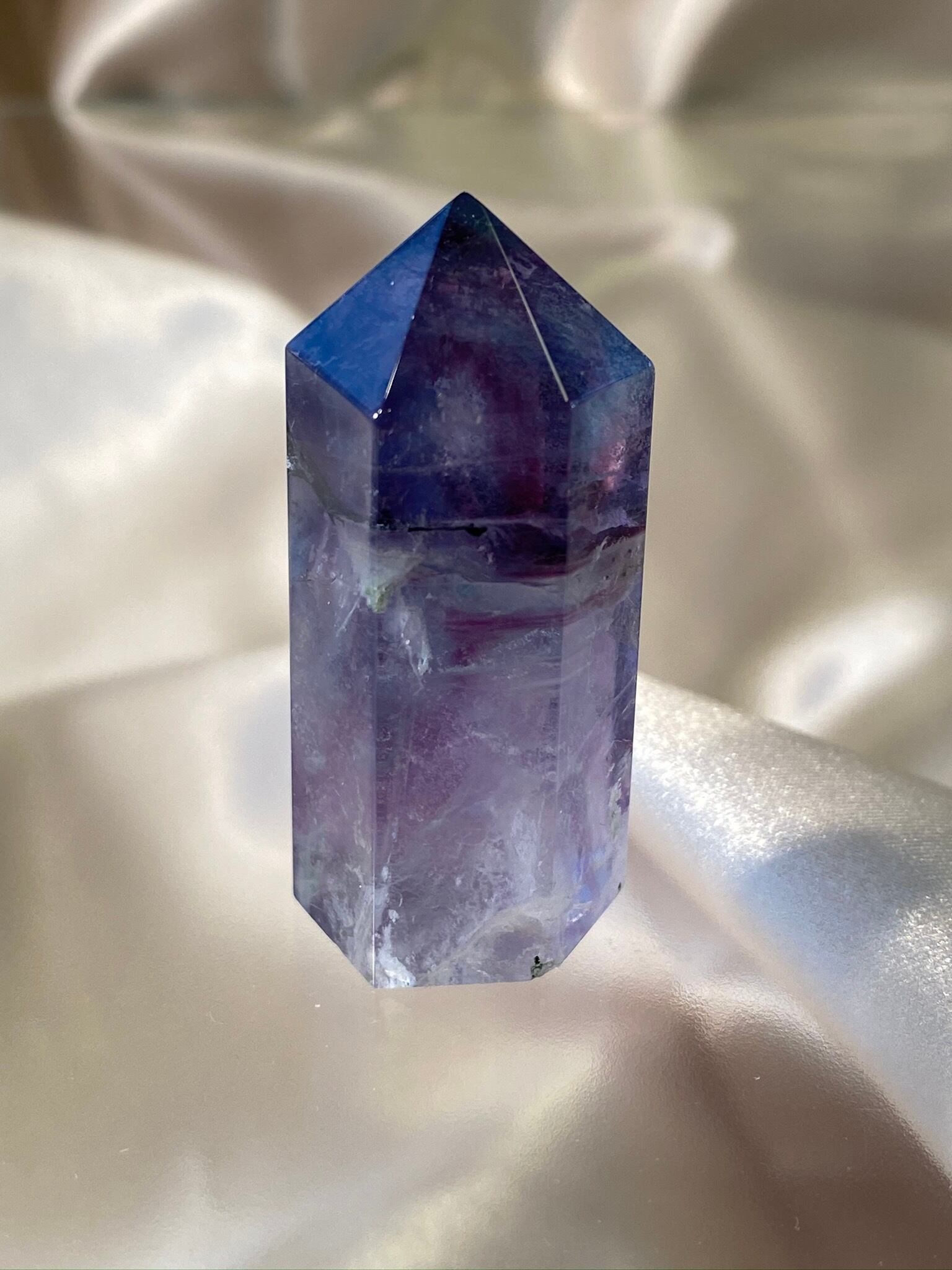 フローライトのポイント型です。グリーンと紫が絵具を混ぜた様なグラデーションになっています。下部には白も入り、天然石の色の魅力を楽しめます。