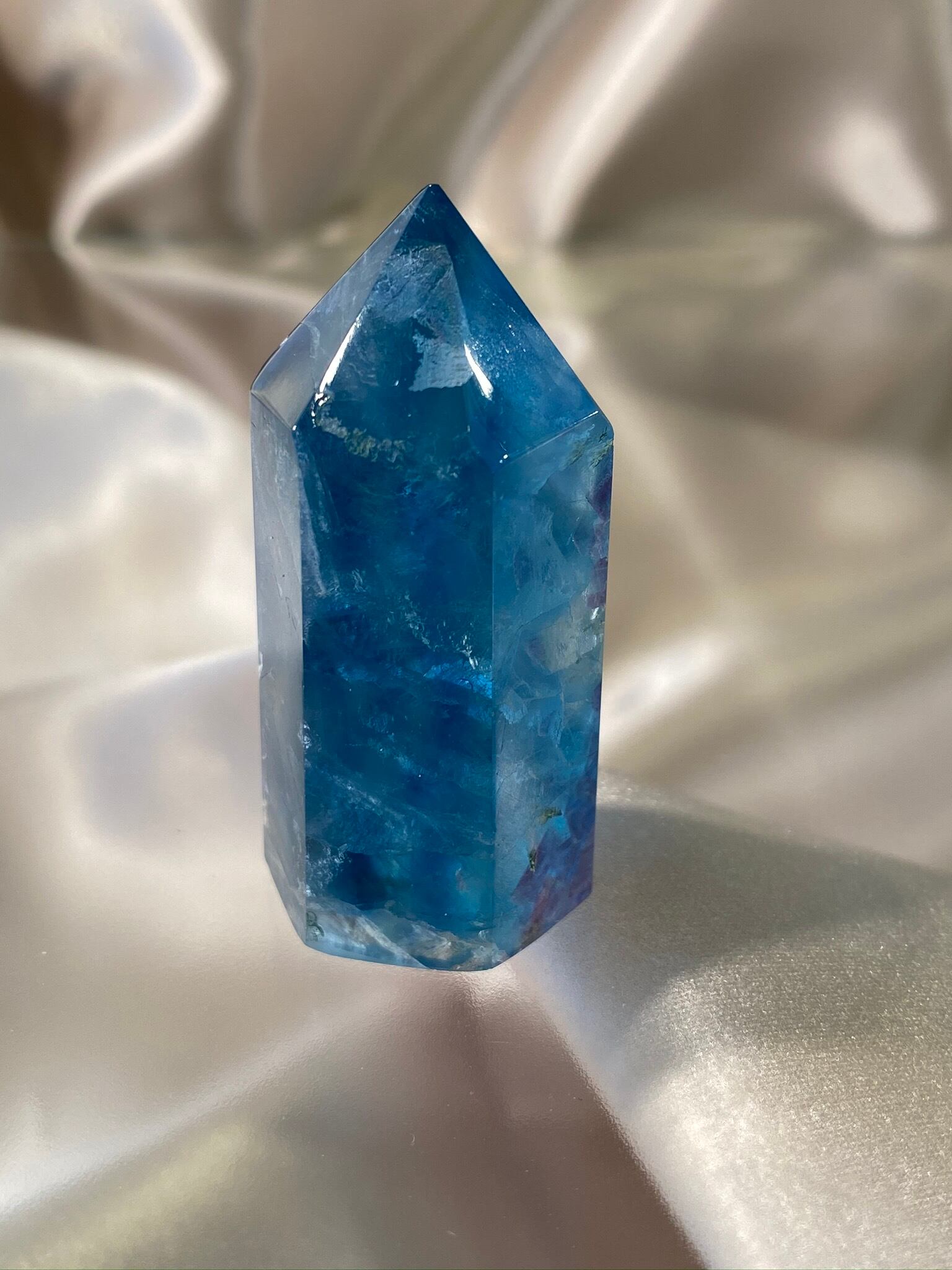 フローライトのポイント型です。グリーンが強めのブルーグリーンが美しい石です。クラックが多く、一色でも色の濃淡が楽しめます。