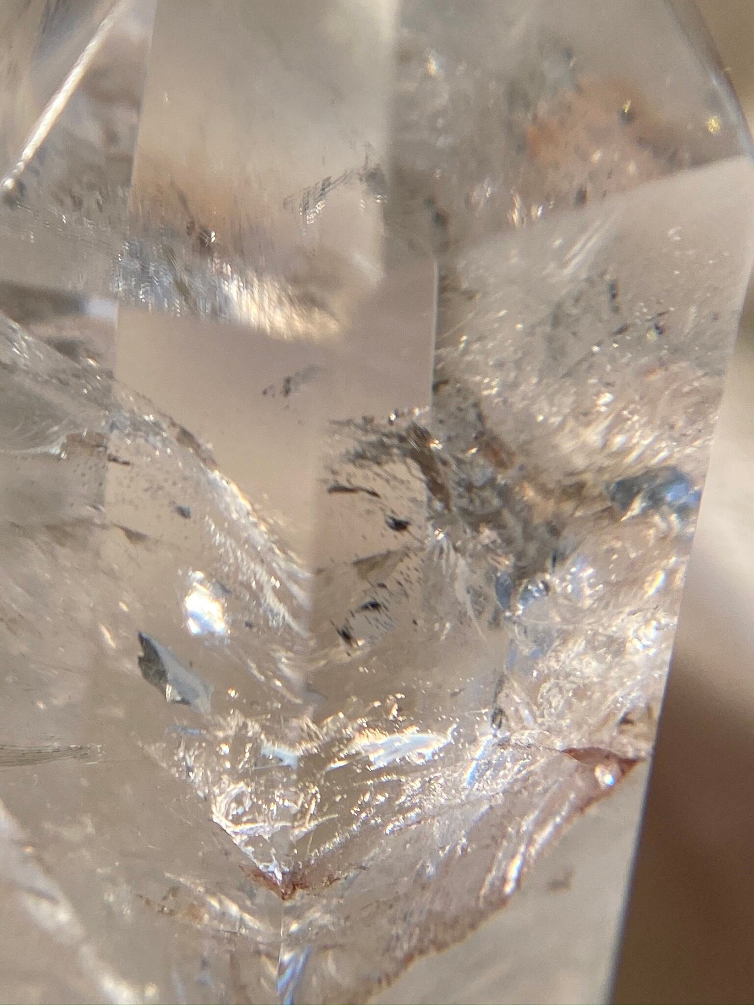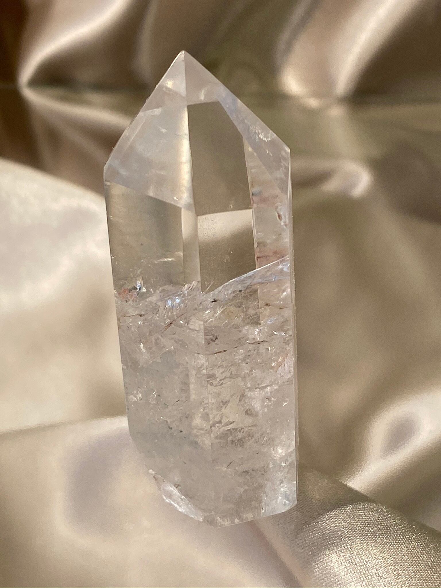 水晶のポイント型です。クラックが光の反射がとても美しい石です。光の加減で虹も見えます。上部は透明度が高いです。輝きが素晴らしく、部屋に飾ると華やかになりそうです。