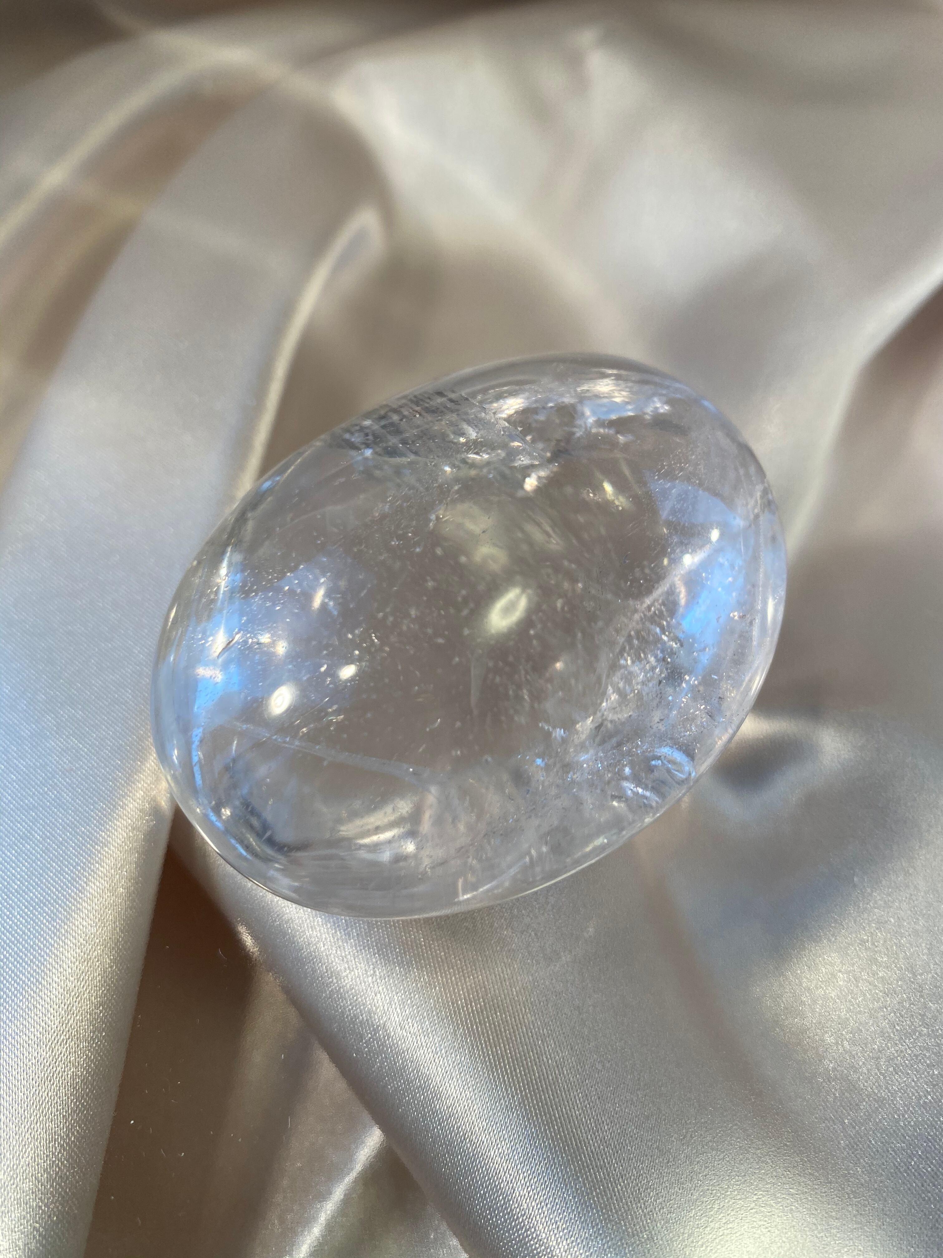 水晶のタンブルです。アイリスクオーツと言って良いほど美しい虹が入っています。透明度が高く、クラックが様々な表情を作る水晶です。握るのにちょうど良いサイズです。存在感もあるのでインテリアとしてお部屋に。