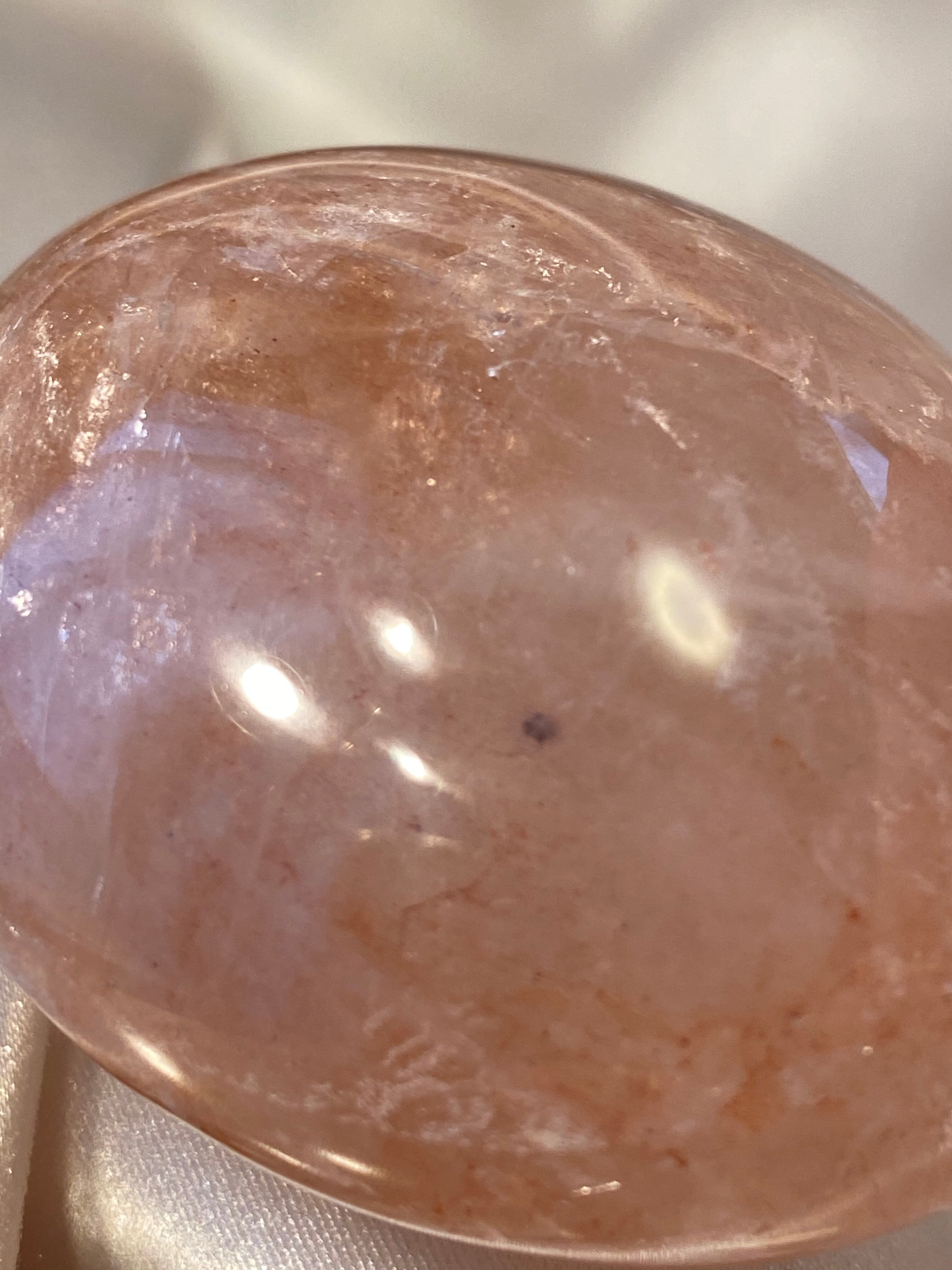 明るいオレンジピンクのオーロラクオーツです。内包物やクラックが様々な表情を作り、見ているだけで明るい気分になるような水晶です。握るのにちょうど良いサイズです。