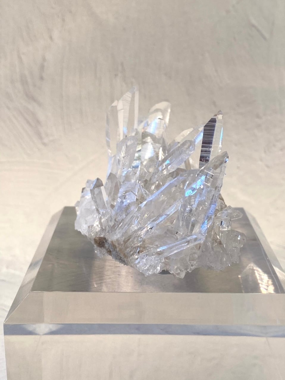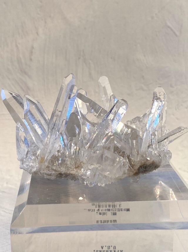 アメリカアーカンソー州産の水晶クラスター原石です。透明感が高く、ひとつひとつの結晶がしっかりとしていて美しく輝く水晶です。存在感があります。