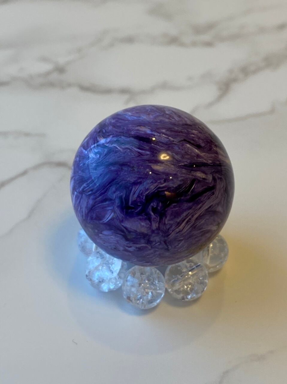 濃い紫色がしっかり出ていて、マーブルの質感も美しい丸玉です。