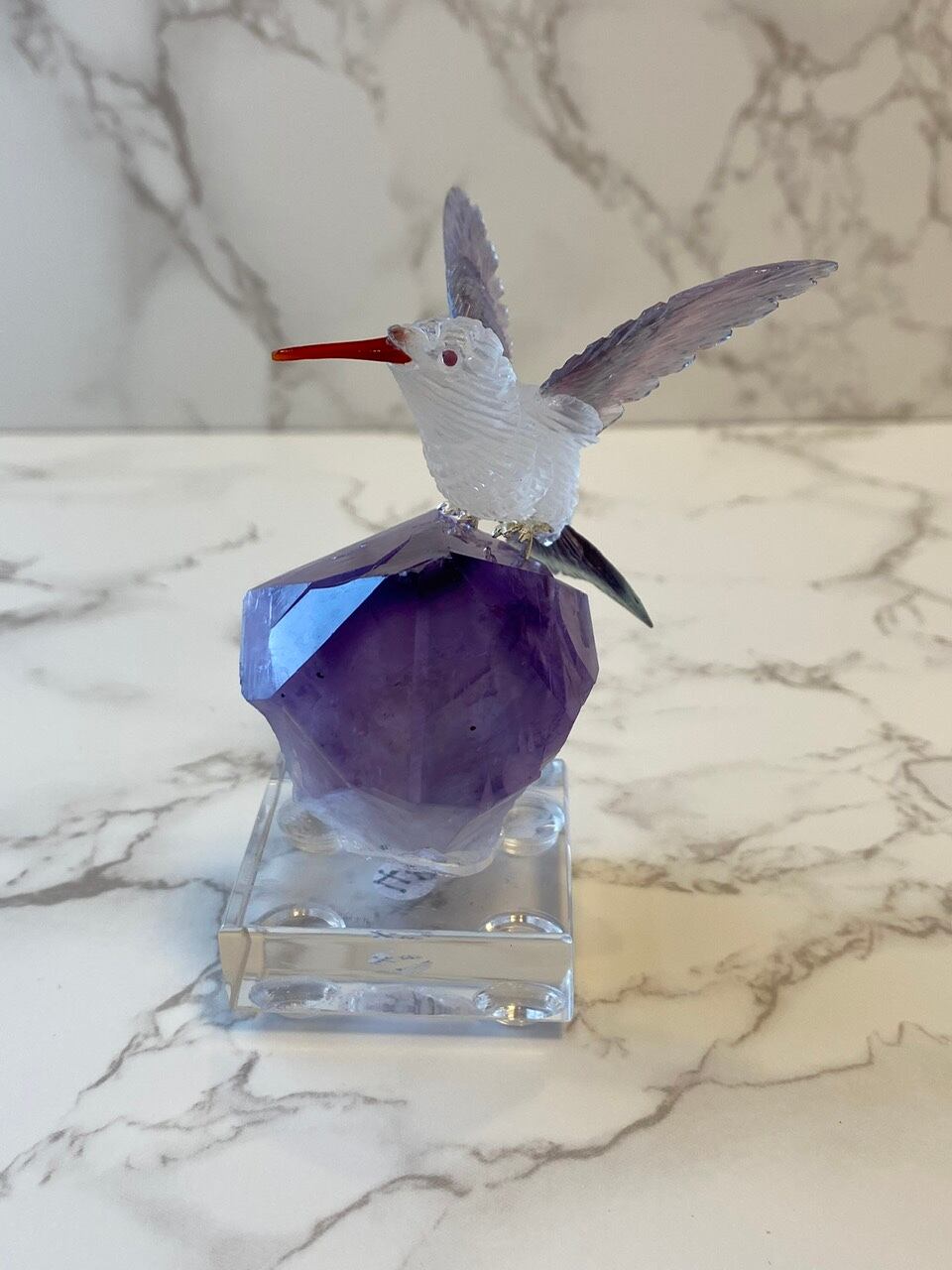 天然石のハチドリです。アメシストの台にボディは水晶、翼はフローライトのハチドリ。