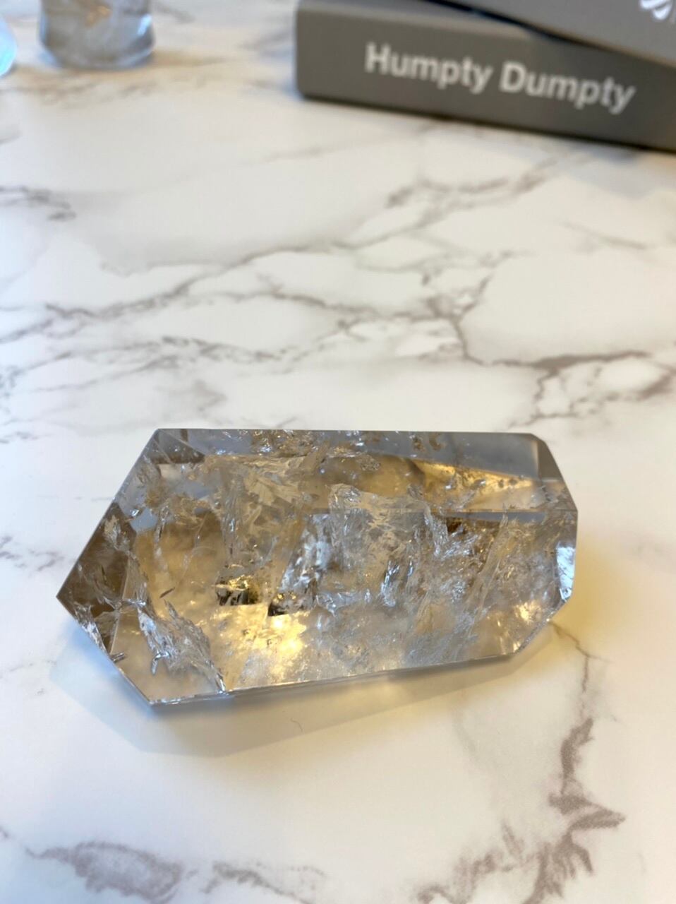 珍しい多角形のクオーツのオブジェです。スモーキーがかった色合いです。角度によって虹が見えます。